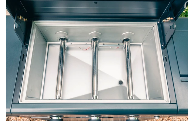 La barbacoa de gas ofrece, entre otras cosas, un encendido piezoeléctrico para encender fácilmente los quemadores. Las tapas de los quemadores integradas en la rejilla de la barbacoa ayudan a evitar fogonazos e incendios provocados por la grasa.