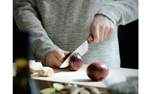 La serie de cuchillos Norr ofrece una experiencia sólida y auténtica para el corte clásico. Los materiales de alta calidad lo convierten en una opción sostenible y económica. El gran cuchillo de cocinero Norr tiene una hoja fuerte que lo hace perfecto para la mayoría de las tareas de corte, como picar carne y verduras. La hoja está hecha de acero inoxidable alemán de alta calidad. El material del mango es madera de arce noruego certificada por el FSC (Forest Stewardship Council) en un 70% y tratada con Kebony para aumentar su estabilidad y dureza.