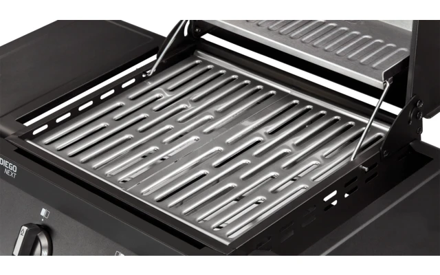 DEMASIADO ESPACIO PARA SER PEQUEÑO. Las barbacoas de la clase SAN DIEGO NEXT han experimentado un cambio de diseño. Ahora no sólo son milagros de la cultura de la barbacoa, sino también un regalo para la vista aún mayor de lo que ya eran. Disponibles con dos o cuatro quemadores, los modelos ofrecen amplias zonas de preparación y almacenamiento, ocupando el mínimo espacio. Condiciones ideales para pequeñas terrazas, mini-balcones o encuentros chisporroteantes. Las rejillas incorporadas son robustas y, además de un estante grande para platos y alimentos a la plancha, tienen dos más en los laterales, para especias o salsas, por ejemplo. Una rejilla calientaplatos de acero inoxidable oscila suavemente al abrir y cerrar el capó. Y la parrilla, también de acero inoxidable resistente, es muy fácil de limpiar después de la sesión de chisporroteo. Y hablando de limpieza: El diseño limpio y negro mate de la parrilla de gas con quemadores de acero inoxidable encaja perfectamente en cualquier ambiente imaginable.