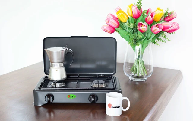 cocina de 2 llamas de gas, quemador de aleación Pyral N2, tapa del quemador esmaltada, soporte de olla de acero plano esmaltado. Gran diseño gracias a su especial color gris oscuro