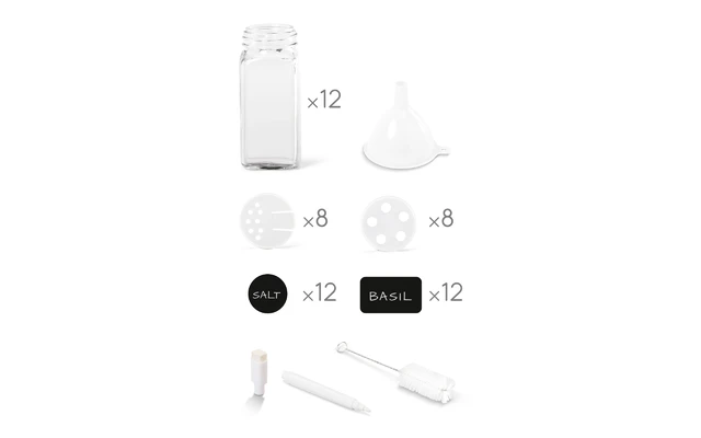 – Con 16 inserciones de espolvoreo intercambiables (8 x finas, 8 x gruesas) y 24 etiquetas autoadhesivas (12 x redondas, 12 x rectangulares)