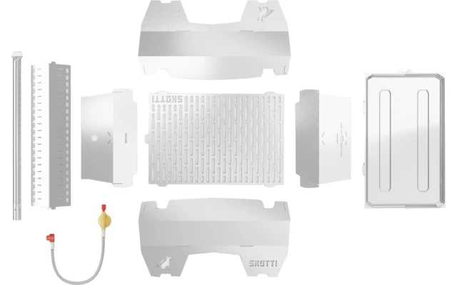 Lo tendrá todo tal y como está acostumbrado en el SKOTTI: su parrilla SKOTTI cabrá sin esfuerzo en cualquier autocaravana, mochila de senderismo, furgoneta, canoa, en la bolsa de la moto o en el portaequipajes. O simplemente puede llevarla bajo el brazo – incluyendo la bolsa, SKOTTI pesa sólo 3,3 kg. por cierto: el tubo del quemador y la manguera de gas están bien protegidos en los dos bolsillos del interior de la bolsa, que por supuesto se incluye en la entrega.