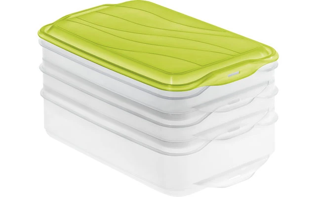 Después de las compras del fin de semana, ¿su nevera suele estar a rebosar? Días después, la salchicha está descolorida y el queso reseco? Ahora sí: el Foodcenter ofrece espacio suficiente para alimentos perecederos como embutidos, productos lácteos, fruta o restos de tus comidas caseras. Gracias a los dos recipientes rectangulares que se pueden apilar uno dentro del otro, el espacio del frigorífico se aprovecha de forma óptima sin que se transfieran los diferentes olores y aromas. Así, los alimentos se mantienen frescos y sabrosos durante mucho más tiempo, y no acaban en la basura después de unos pocos días. Las cajas transparentes ofrecen siempre una visión y garantizan que sus suministros no se olviden. El Foodcenter Rondo también es útil para las excursiones, los picnics o las caminatas: transporta los sándwiches, las coberturas de los sándwiches y las ensaladas por separado y prepara tu merienda de descanso de forma muy sencilla y fresca.