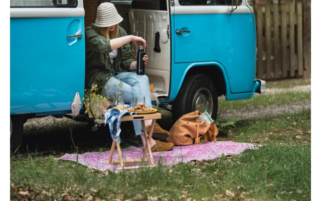 Botella termo de acero inoxidable de doble pared con asa de transporte y tapón de rosca de bambú. Disponible en los colores negro, salmón, marrón y blanco