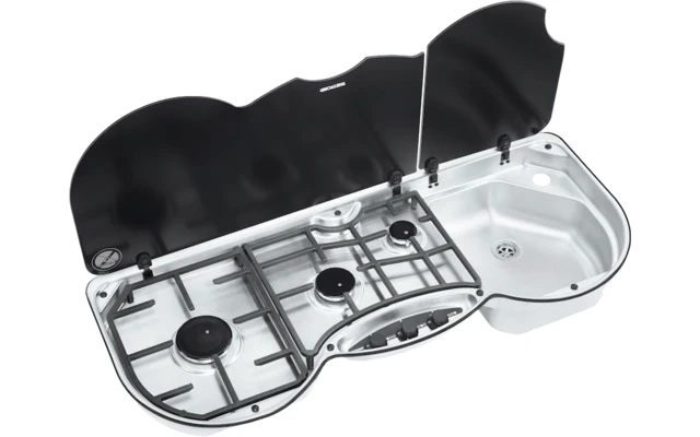 La serie 353 de Thetford combina con éxito tres quemadores y un fregadero. La serie combinada 353 da a la cocina de ocio un aspecto que le hace sentirse como en casa. Las dos partes de la tapa de cristal pueden cerrarse por separado, proporcionando una superficie de trabajo extra o un espacio para ordenar. La placa de cocción también ofrece espacio para sartenes más grandes, como en casa. El encendido eléctrico con una sola mano facilita el encendido de los quemadores y toda la combinación es robusta y fácil de limpiar.